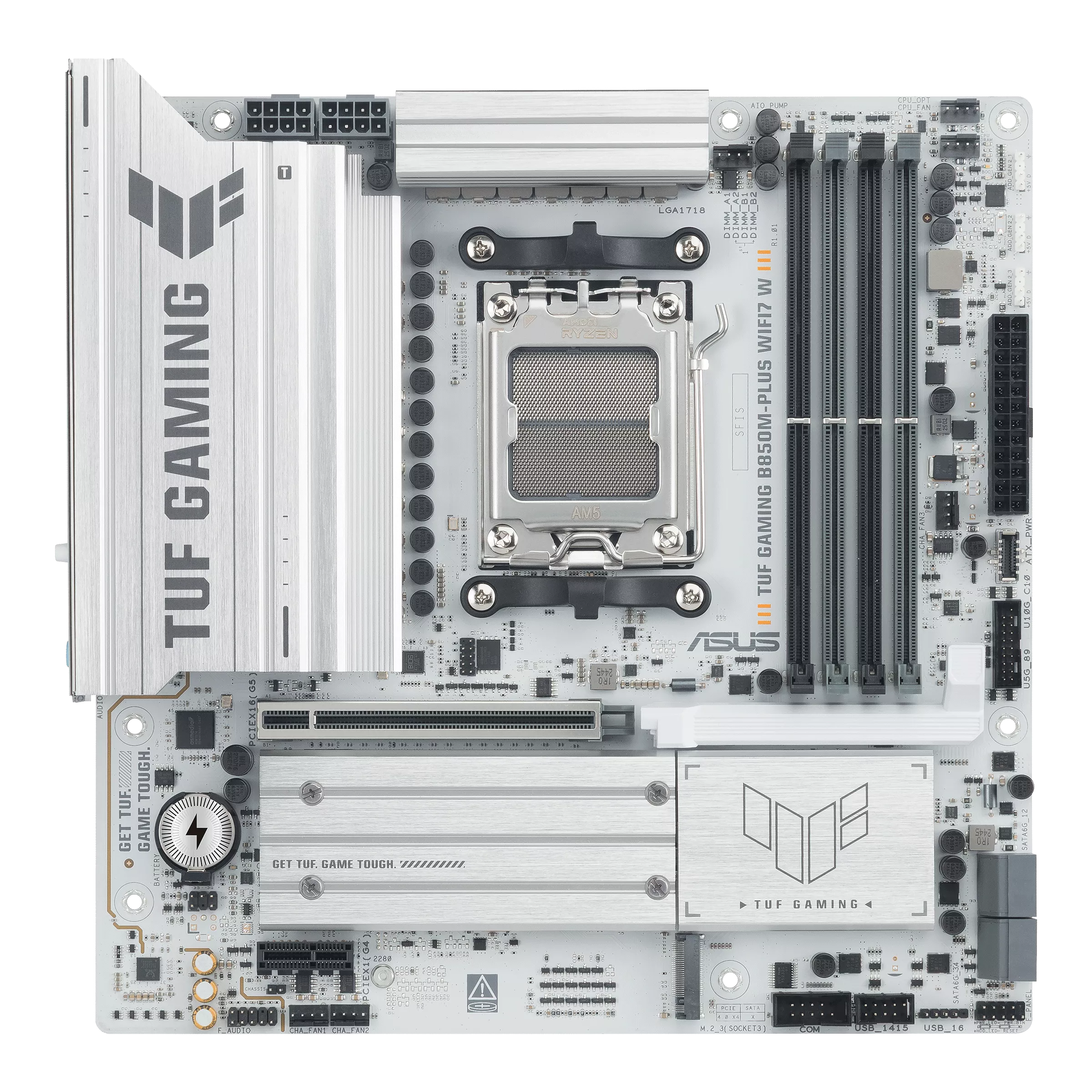 ASUS TUF GAMING B850M-PLUS WIFI7 W הוא לוח אם מתקדם בפורמט micro-ATX, המיועד למעבדי AMD Ryzen מסדרות 7000 / 8000 / 9000 בתושבת AM5. הוא משלב בין מערך חשמל חזק, תמיכה בזיכרונות DDR5 מהירים, קישוריות מתקדמת עם WiFi 7, חריץ PCIe 5.0 לכרטיס מסך ומערך קירור איכותי – כך שהוא מהווה בסיס מצוין למחשב גיימינג, עבודה ו-AI PC מודרני.